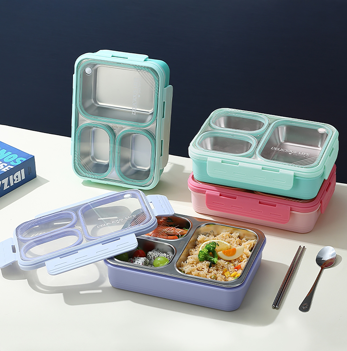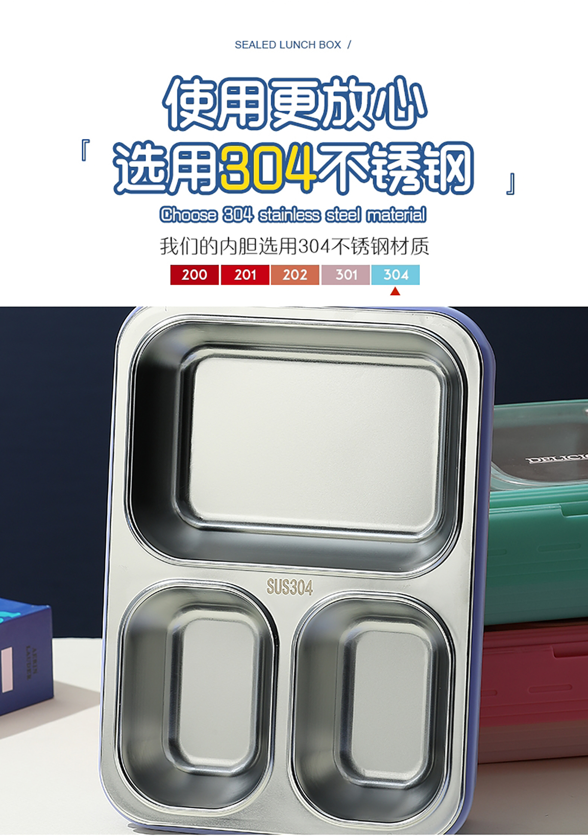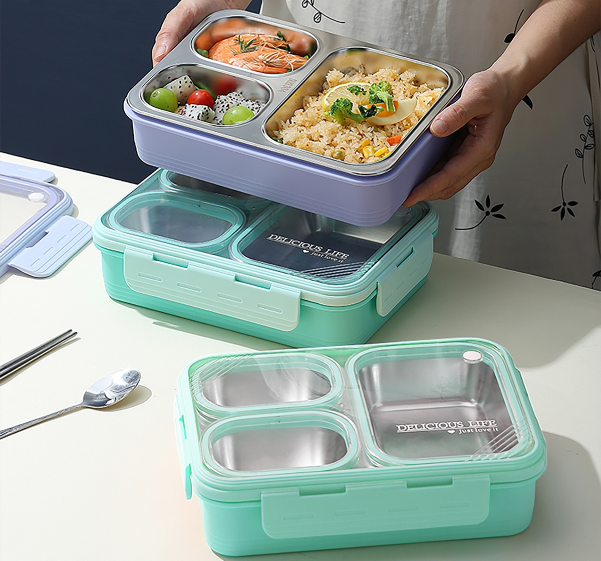 中號(hào)3格不串味不銹鋼餐盒850ml