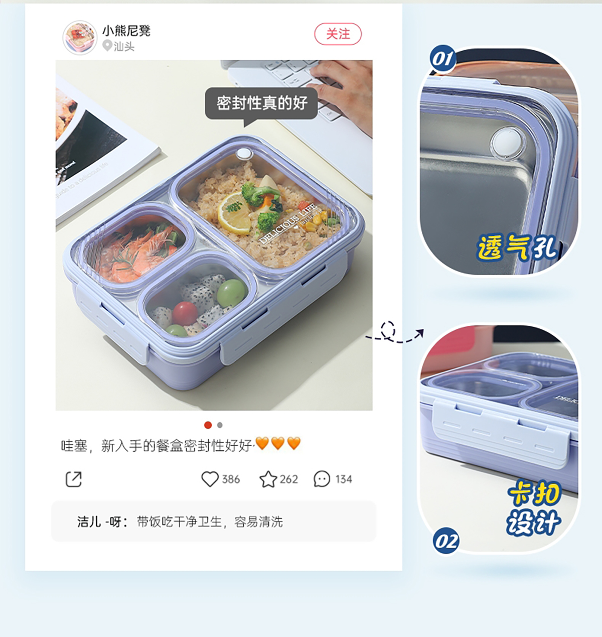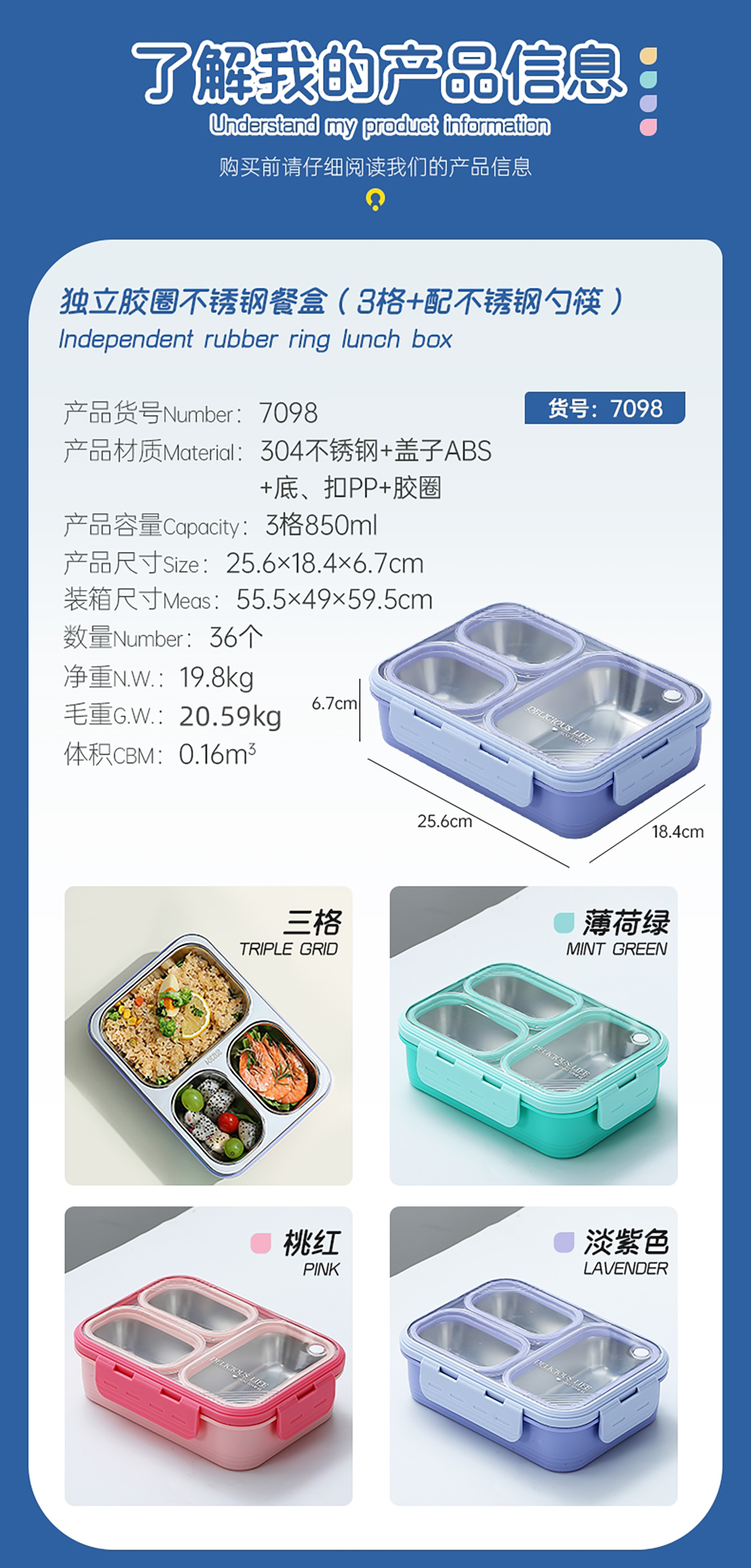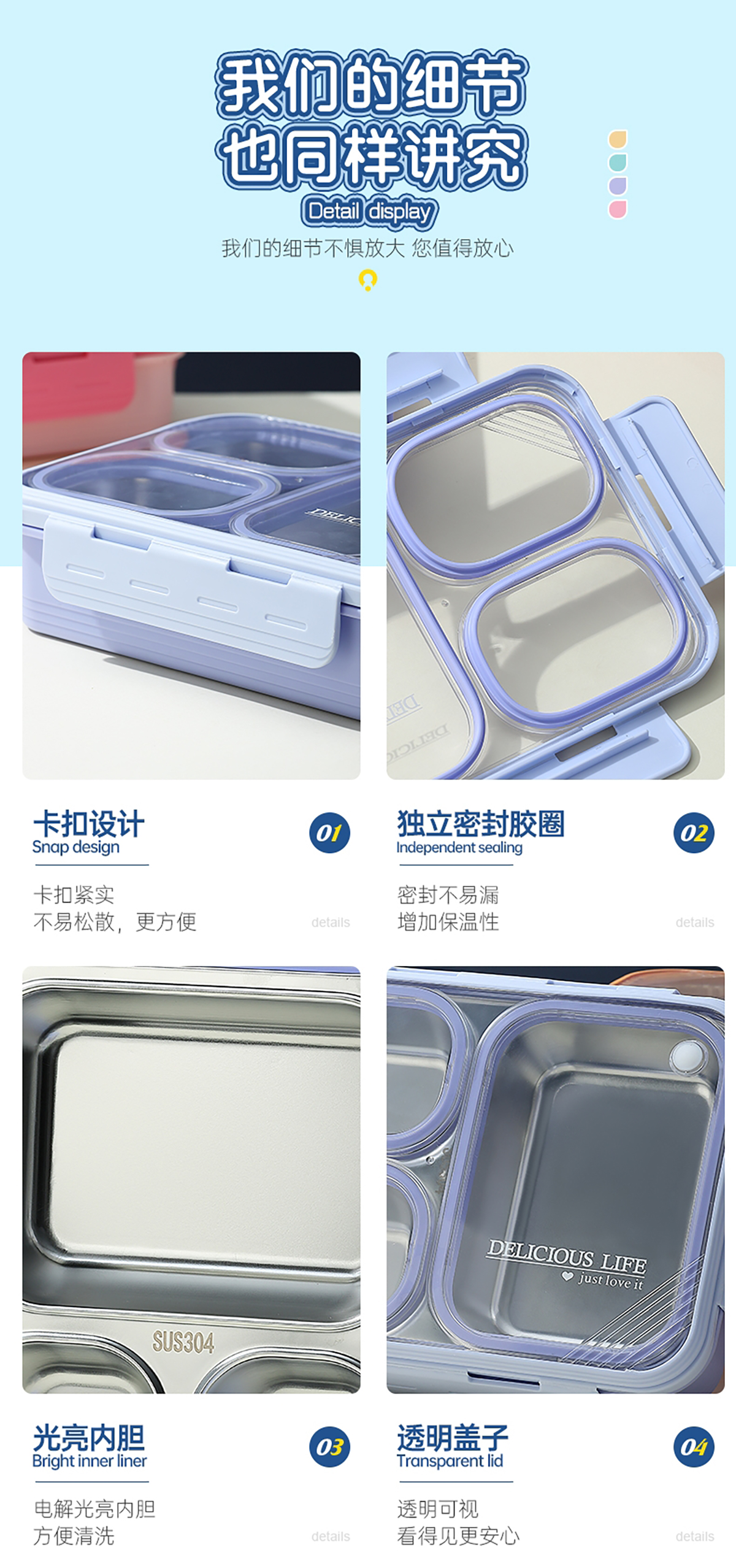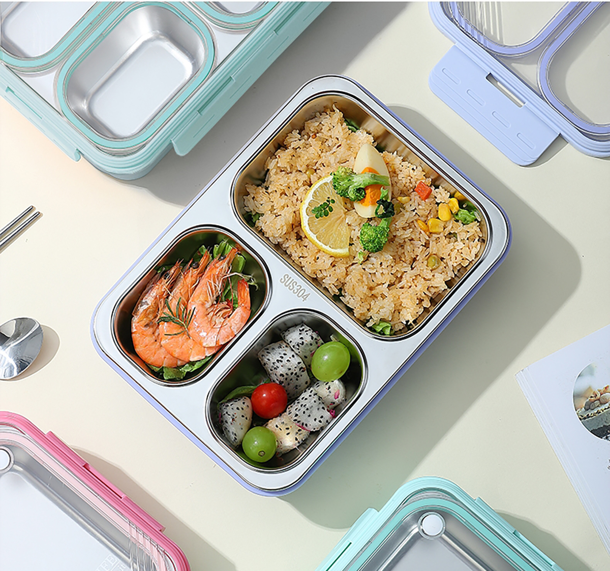 中號(hào)3格不串味不銹鋼餐盒850ml