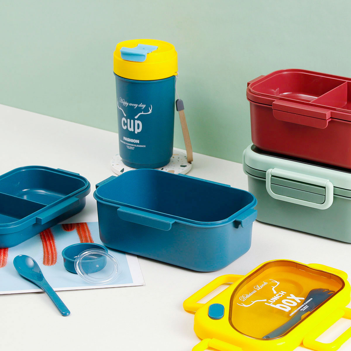 品悅長方雙層密封飯盒(1100ml)(含醬料盒)+圓形/八角隨行杯(500ml)