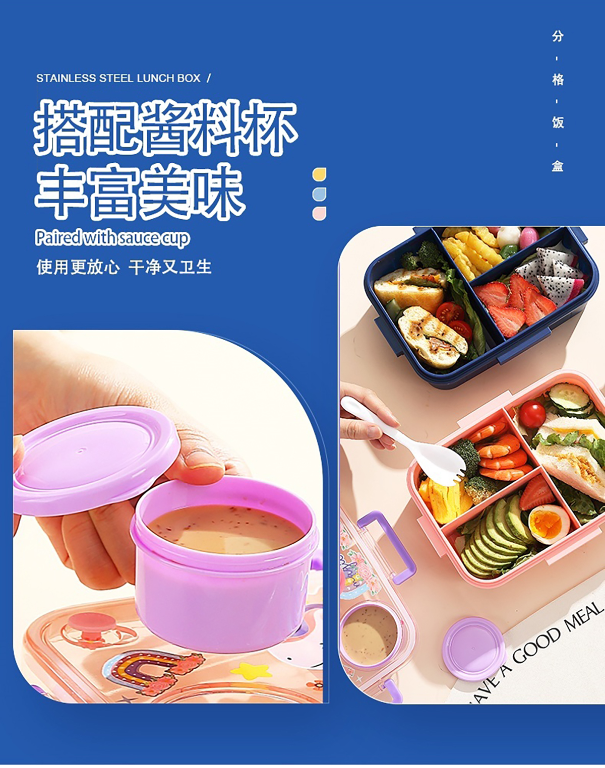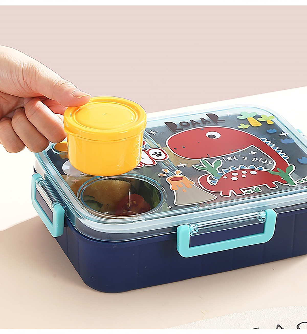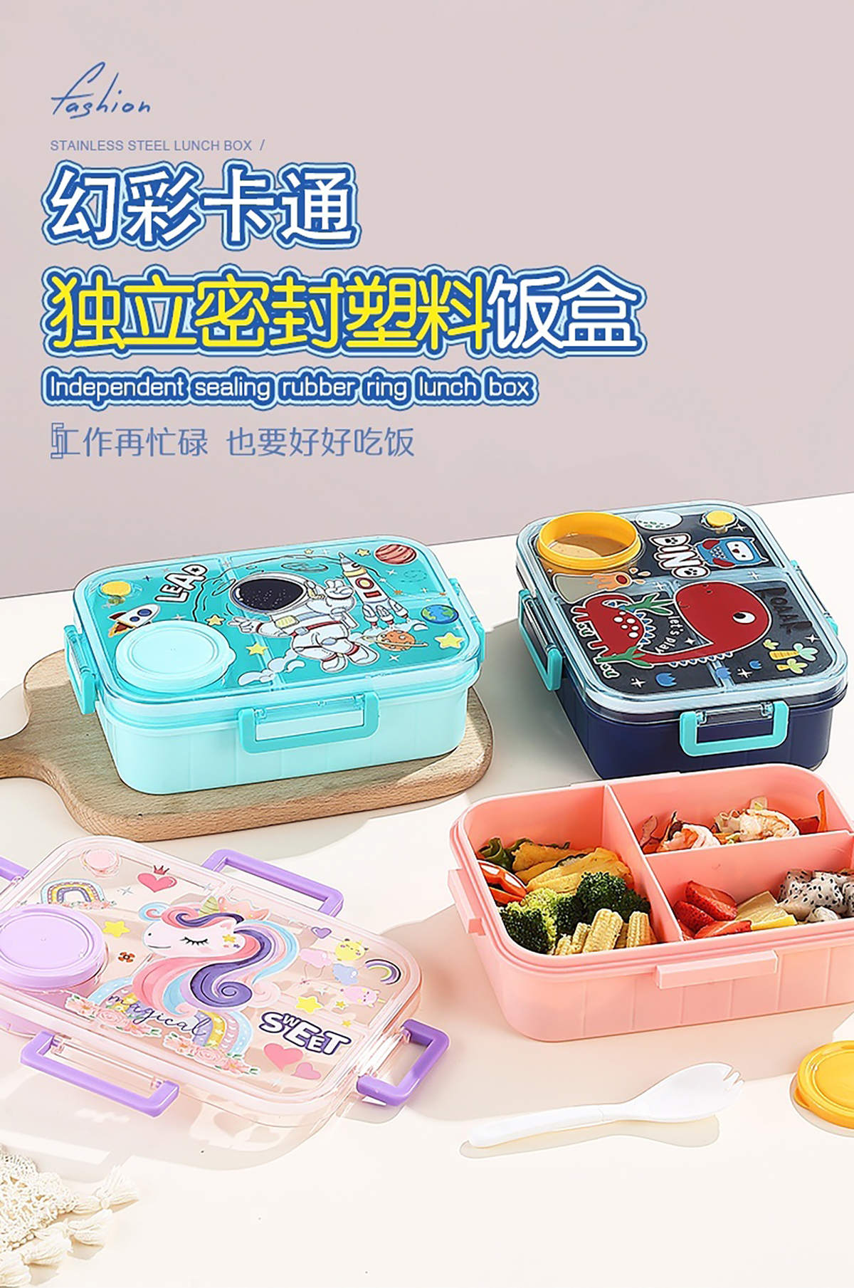 1.2L幻彩卡通獨(dú)立密封塑料餐盒(2格/3格+醬杯80ml+PP勺)
