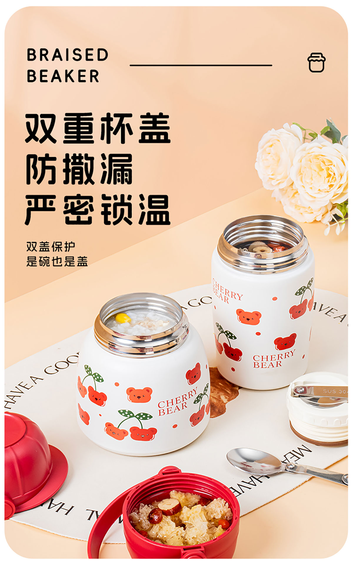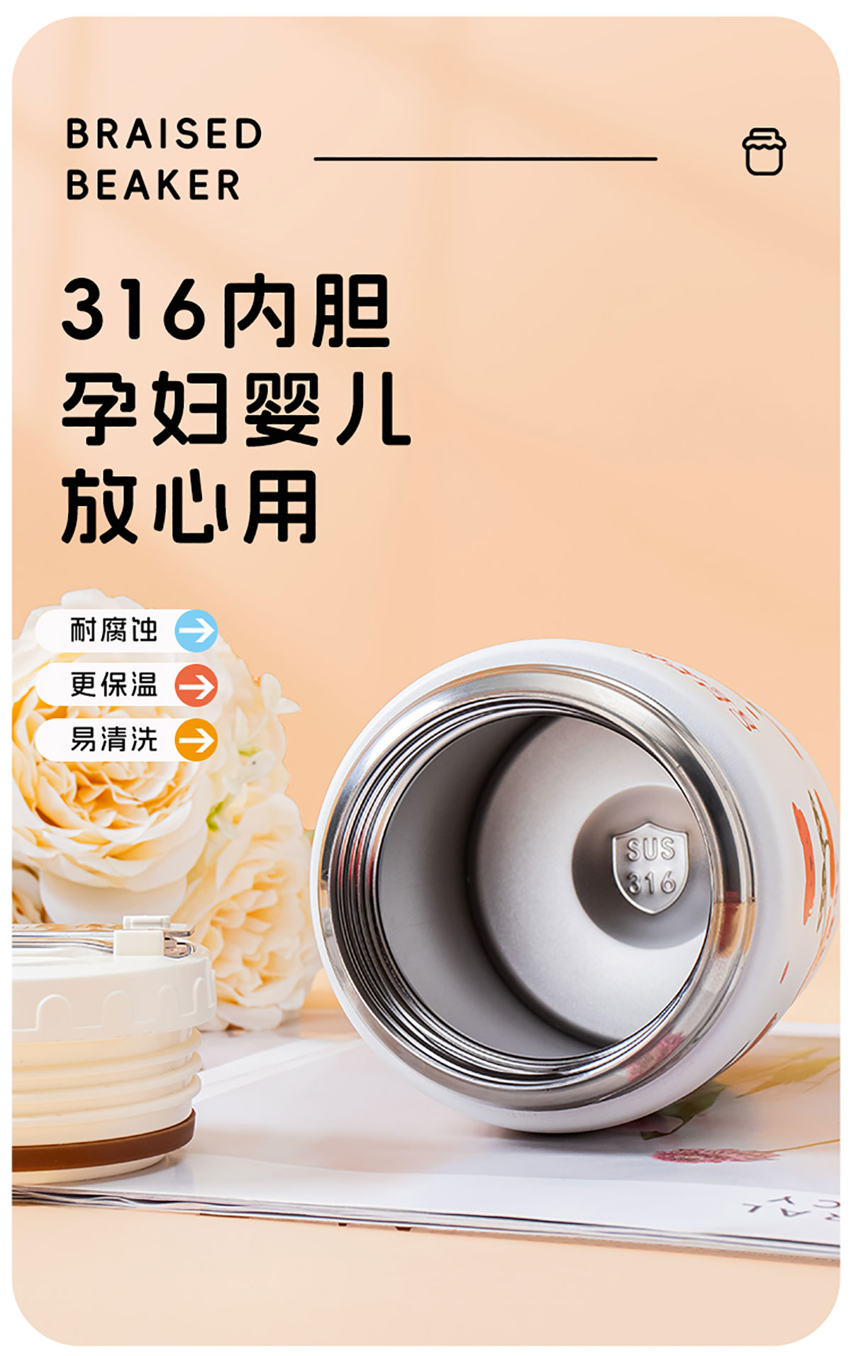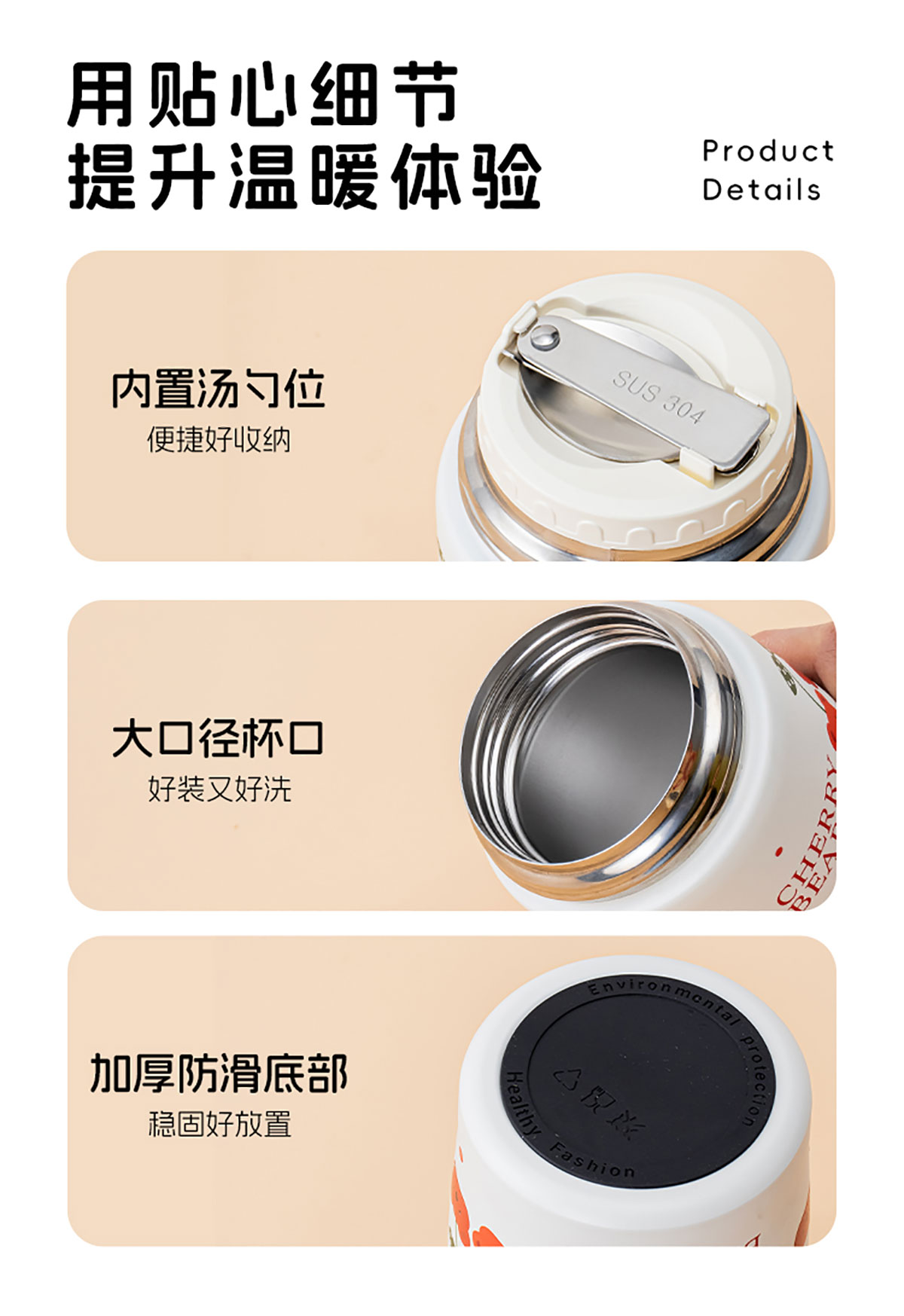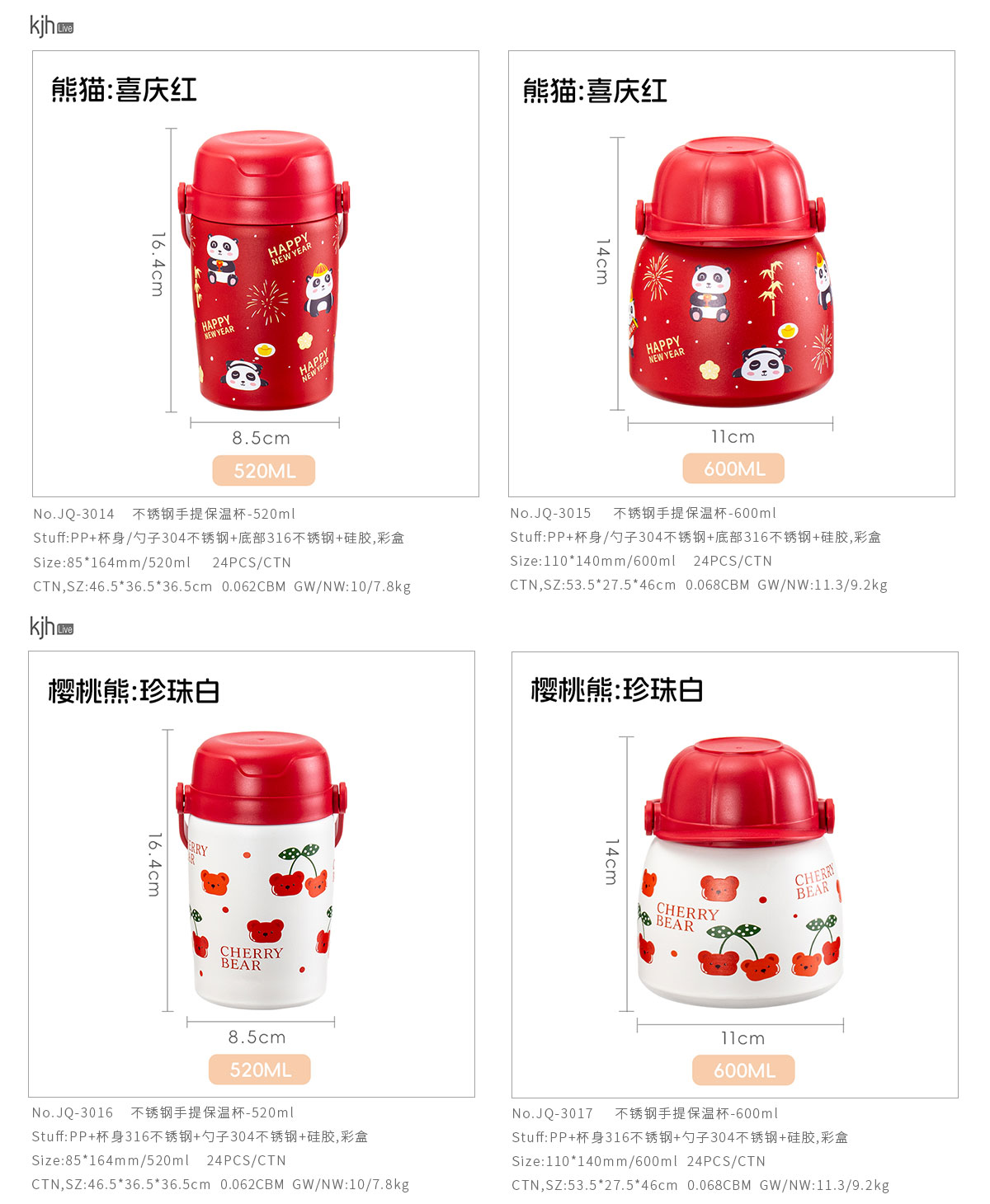 Stuff:JQ-3014/JQ-3015:PP+杯身/勺子304不銹鋼+底部316不銹鋼+硅膠/彩盒,JQ-3016/JQ-3017:PP+杯身316不銹鋼+勺子304不銹鋼+硅膠/彩盒