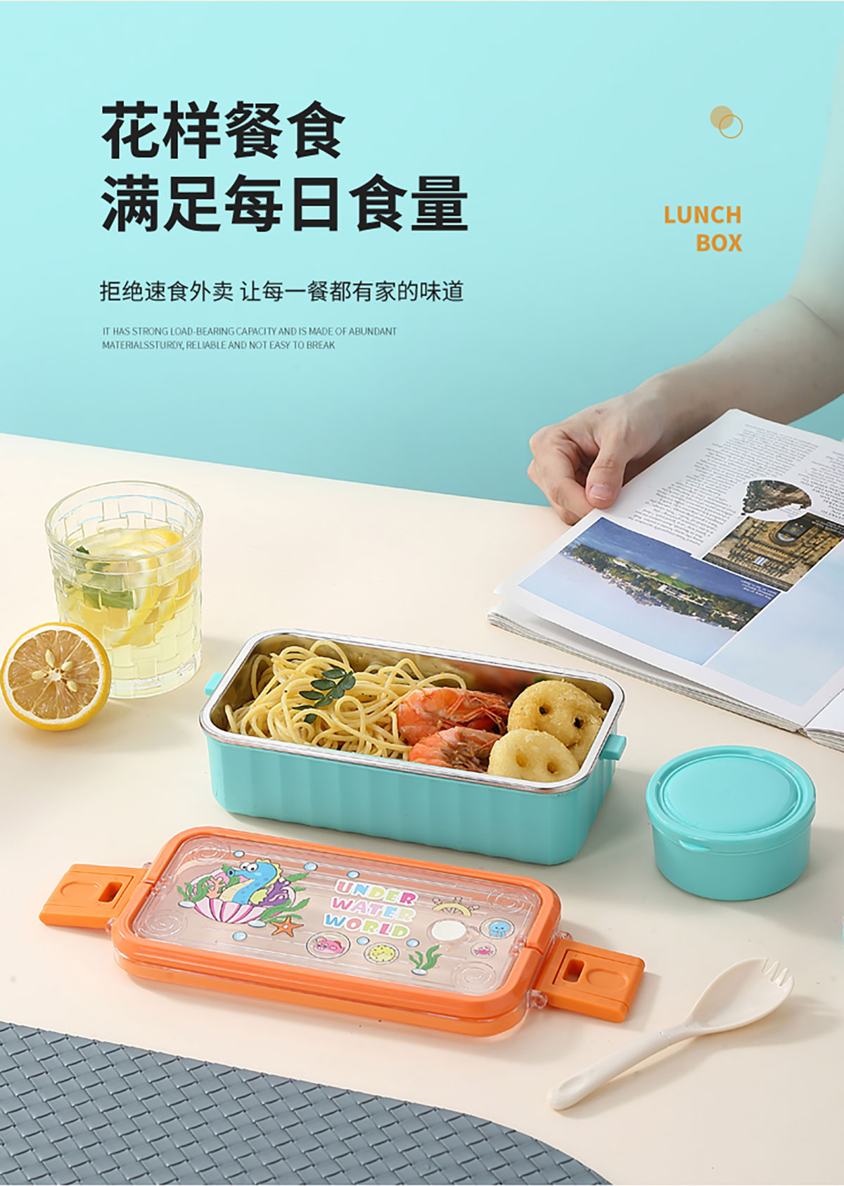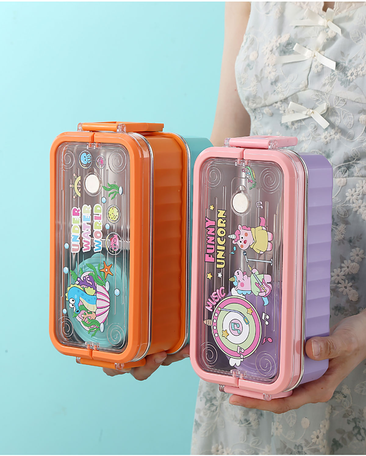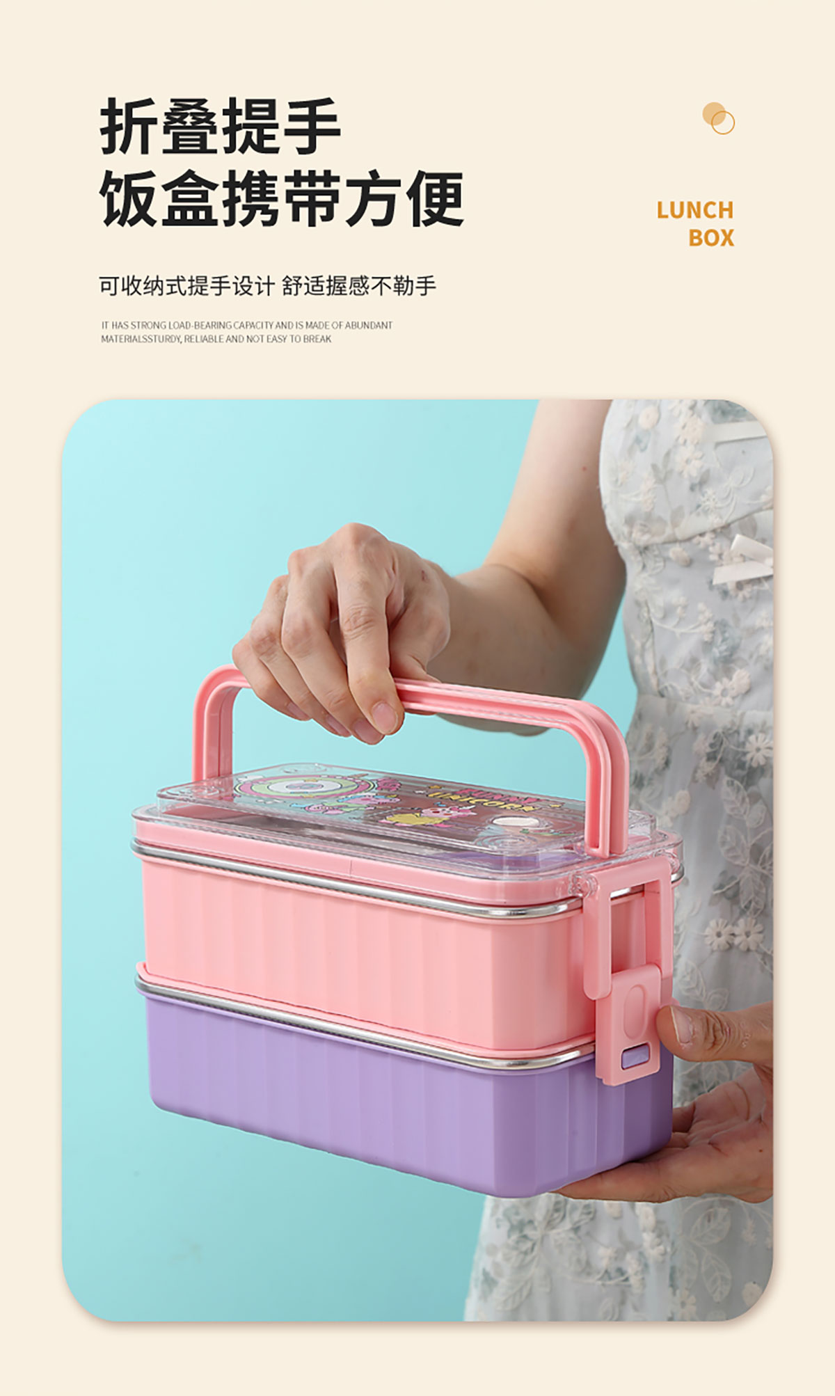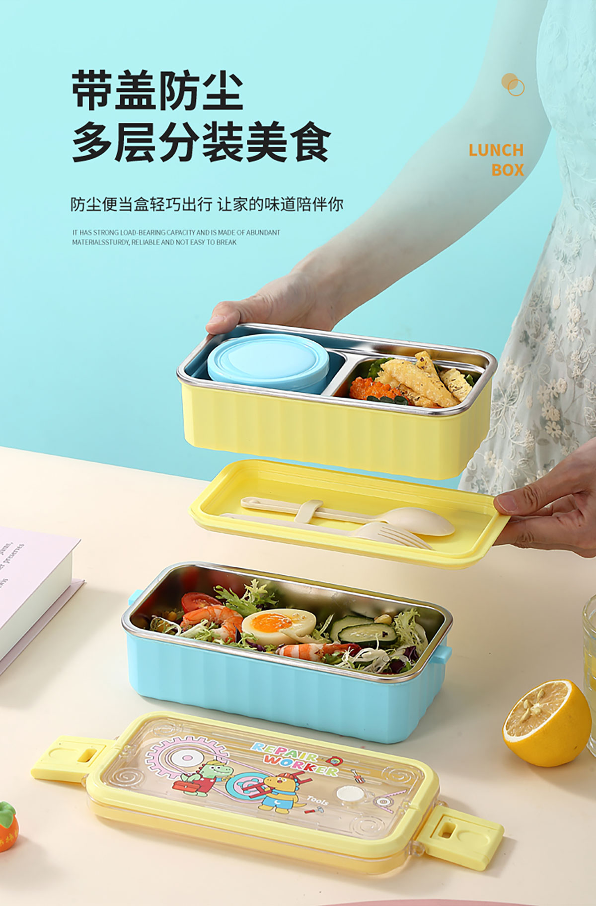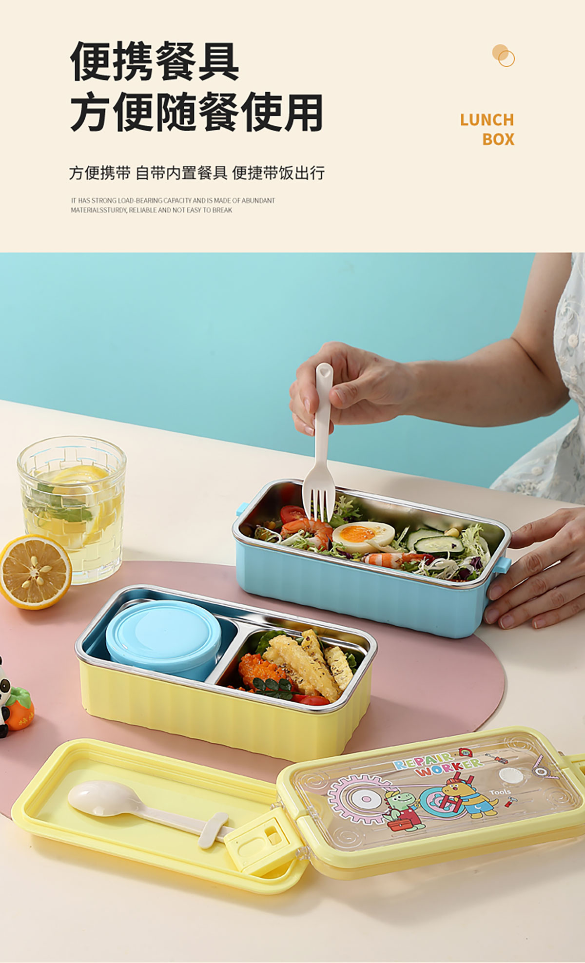 UV 手提單層/雙層卡通不銹鋼餐盒(配PP叉勺+PP湯碗150ml)